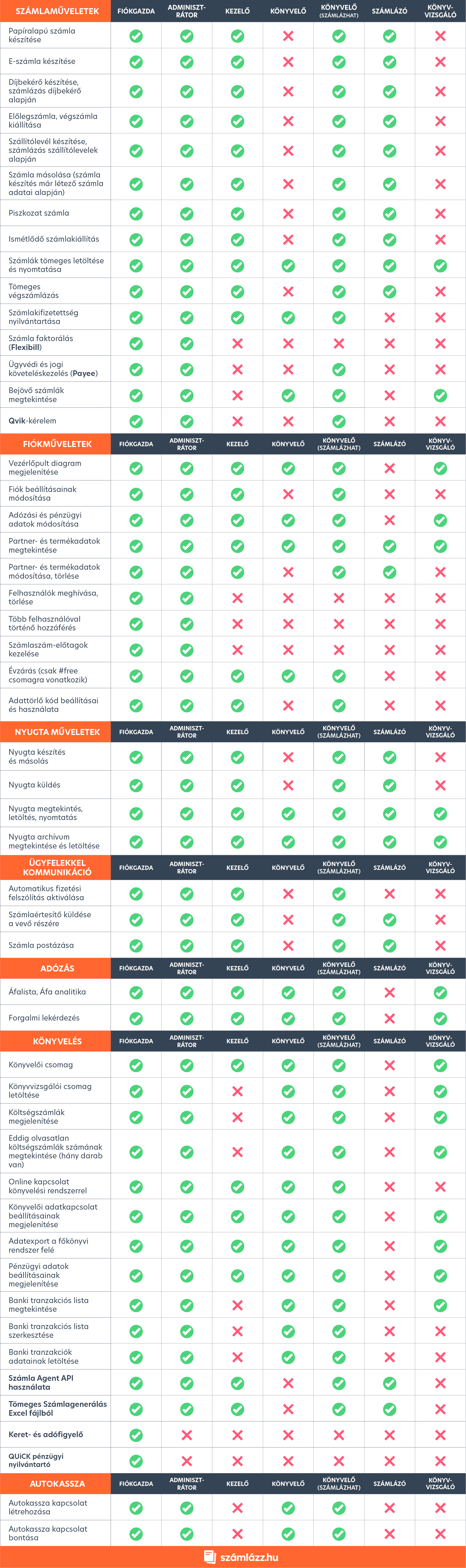 - Könyvelő (#free csomagban is elérhető): Csak olvasási joga van. Amennyiben a számlázási fiókban valamely díjköteles szolgáltatáscsomag érhető el, lekérdezéseket futtathat, listákat és adatexportot kérhet a könyvelői rendszer felé, valamint módosítani tudja az adózási és pénzügyi adatokat.