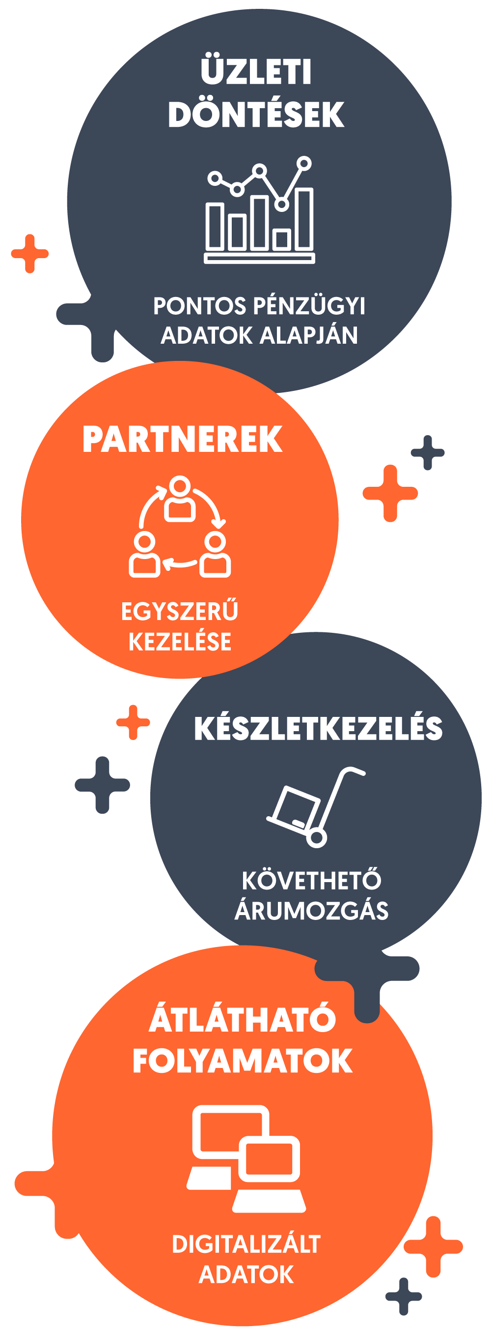 • Munkatársaiddal: raktárosként, értékesítőként, beszerzőként, pénzügyesként, logisztikusként, és vezetőként IS dolgozol? Vagy munkatársaid látják el ezeket a szerepeket? Mind ugyanazt a rendszert tudjátok használni a napi munkátokhoz.