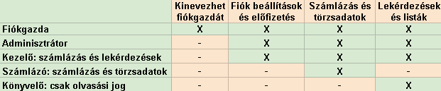 Az Adminisztrátor és a csak olvasási joggal rendelkező könyvelői jogosultság között két, némiképp eltérő jogosultsági szint található.
