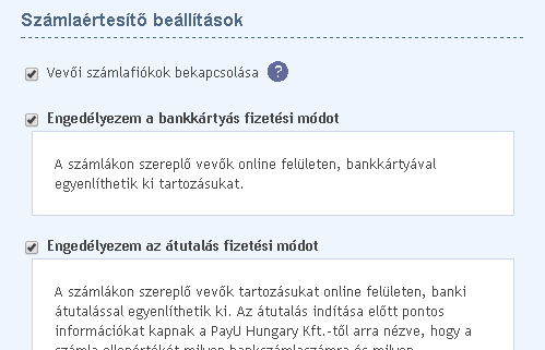 A beállítások oldalon szabályozható, hogy a három fizetési mód közül melyeket engedélyezem.