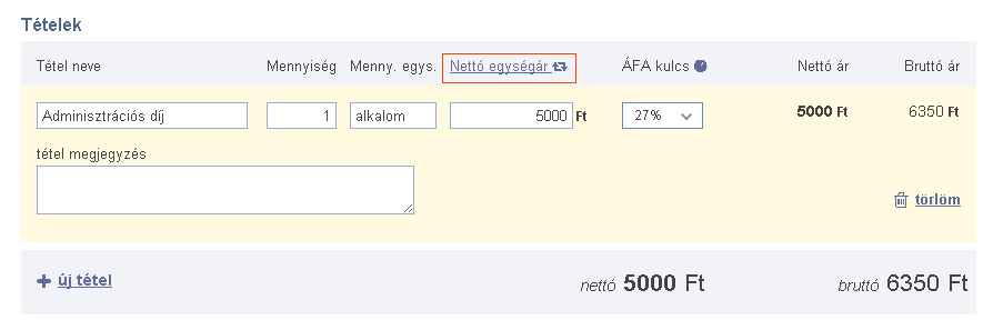 Új számla tétel hozzáadása balra lent, tétel törlése jobb oldalon a kis kuka ikonnal.
