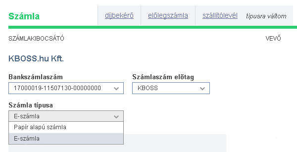 Bankszámlaszám és számlaszám előtag kiválasztása (ha több is van), továbbá papír számla vagy elektronikus számla készítése.