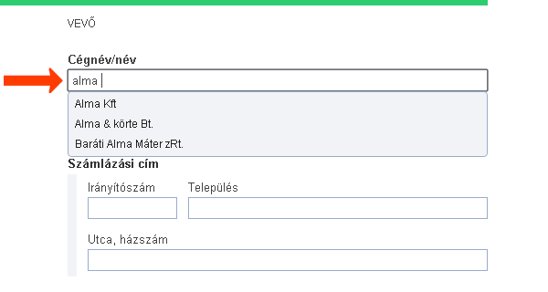 A vevő adatait begépelheted, de gépelés közben mindig kapsz segítséget a rendszerben tárolt korábbi vevőid adatai alapján.