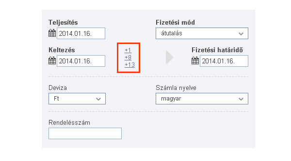 A narancssárgával kiemelt számokkal a leggyakrabban használt fizetési határidőket lehet beállítani (a számla kelthez viszonyítva).