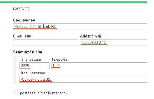 A választást követően a vevő címe és adószáma azonnal megjelenik a szerkesztett számlán.