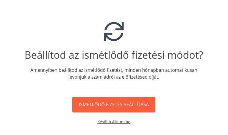 Amennyiben elmentetted kártyádat és az ismétlődő fizetést is engedélyezted, akkor a rendszer a következő előfizetési időszakra eső díjat automatikusan beterheli/levonja a mentett bankkártyádról. Ez körülbelül ugyanúgy működik, mint a csoportos beszedési megbízás, viszont ez neked teljesen ingyenes, hiszen nem átutalás történik, hanem bankkártyás fizetés.
