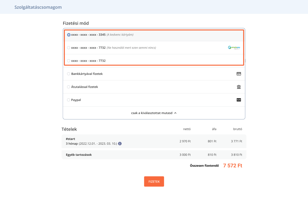 Lehetőséged van több bankkártya mentésére is, ezek közül a bankkártyás fizetés megjelölésekor tudsz választani.