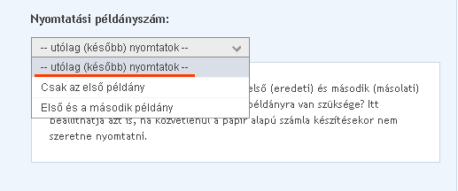 A beállítások között megadhatod, hogy a kibocsátott papír alapú számlák mely példányait szeretnéd kinyomtatni a számla kibocsátásakor. Itt választhatod azt is, hogy a számlák nyomtatása későbbi időpontban történik majd.