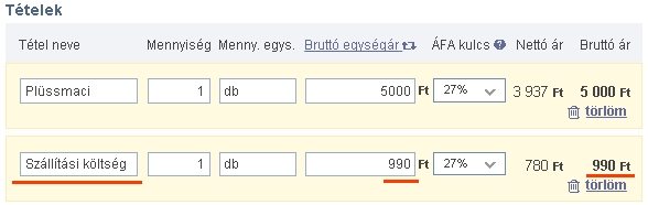 Tegyük fel, hogy bruttó (tehát áfás ár) 990 Ft-ért szállítjuk ki vevőnknek a terméket (webáruház). Ez a tétel külön sorként jelenik meg a számlán, valahogy így: