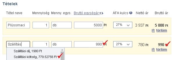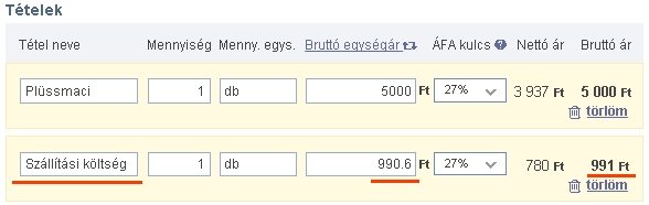 Öt tizedesjegy pontosság mindenre elég 🙂 Új számla szerkesztésekor a ‘Szállítási költség’-et kiválasztva immár a korrekt összeg fogad minket:
