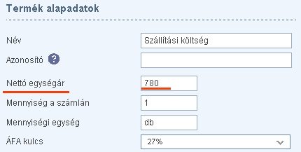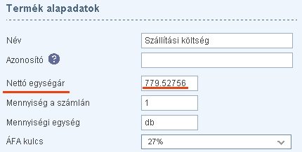 Hát persze hogy nem, hiszen a Számlázz.hu esetén (majdnem) mindenre van megoldás :). A termék adatlapon a ‘Szállítási költség’ nettó árát javítsuk ki a korrekt értékre valahogy így: