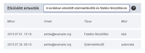 Minden számlánál látható, hogy eddig mikor és milyen emailcímekre küldtél ki számlaértesítőt vagy fizetési felszólítást. Ehhez keresd meg a számlát a számlakereső képernyőn, majd a műveleti sávon keresztül nyisd meg a fizetési felszólítást küldő képernyőt.