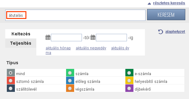 A számlakereső képernyő szöveges keresőmezőjébe beírható a fizetési mód a következőképpen: