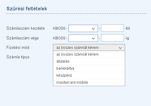 Értelemszerűen csak az ilyen fizetési módú számlákat kapjuk meg a listában, és persze emellett egyéb keresési feltételeket megadhatunk (dátumok, számla típusa).