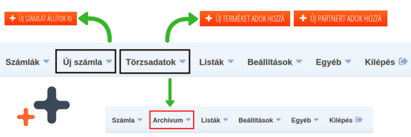 A ‘Törzsadatok’ (korábban ‘Partnerek’, ‘Új partner’, ‘Termékek’, ‘Új termék’ almenükkel) egyik fele (a ‘Partnerek’ és ‘Termékek’) bekerült a ‘Beállítások’ alá, a másik fele (‘Új partner’ és ‘Új termék’ létrehozása) pedig dedikált gombokkal eddig is elérhetőek voltak, úgyhogy ez a mindannyiunk számára oly kedves menüpont – akár egy díjbekérő számla kiállításakor – kötelességét megtette, és mehet. Az ‘Új Számla’ mint főmenü pedig szintén a megfelelő helyen megtalálható dedikált gomb miatt vonulhat nyugdíjba pihenni egy nagyot.