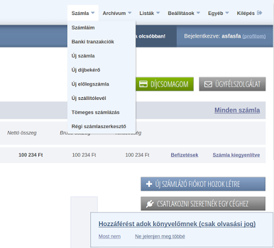 A korábbi ‘Számlák’ és ‘Új számla’ elnevezésű menüket gyakorlatilag összevontuk: a korábban az ‘Új számla’ alatt indított folyamatok (számla, díjbekérő, előlegszámla, díjbekérő kiállítása) mostantól a sokkal egyszerűbb ‘Számla’ főmenü alatt találhatóak, és ott sorakoznak a ‘Számláim, ‘Banki tranzakciók’, ‘Tömeges számlázás’ almenük, és a ‘Régi számlaszerkesztő’.