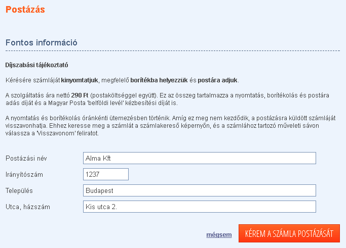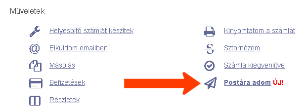 3. Kattints az ikonra vagy a Postára adom feliratra. A megjelenő képernyőn add meg a postázási adatokat, és küldd a számlát közvetlenül a postára!