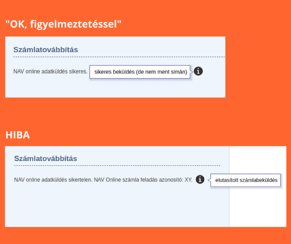 - OK, figyelmeztetéssel – a számlát a jogszabálynak megfelelően beküldtük, ellenőrzés esetén sem lesz mulasztási bírság, viszont a beküldés során a NAV formai hibát vagy rendellenességet észlelt.