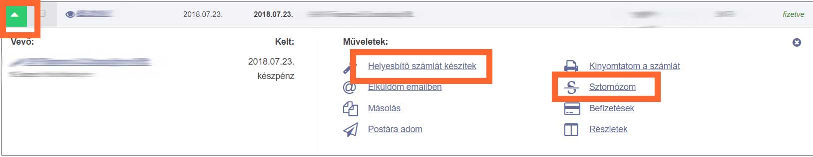 Amennyiben kiállítottál egy számlát, amelyen valamilyen adat rosszul szerepel, és sztornóznod kell, azt a következőképp tudod megtenni: a „Kimenő számláim” menüpont alatt, a kiállított bizonylat előtt található színes nyílra kattintva válaszd a „Sztornózom” lehetőséget. Fontos, hogy a sztornószámla teljesítési dátuma megegyezzen az eredeti számla teljesítési dátumával.