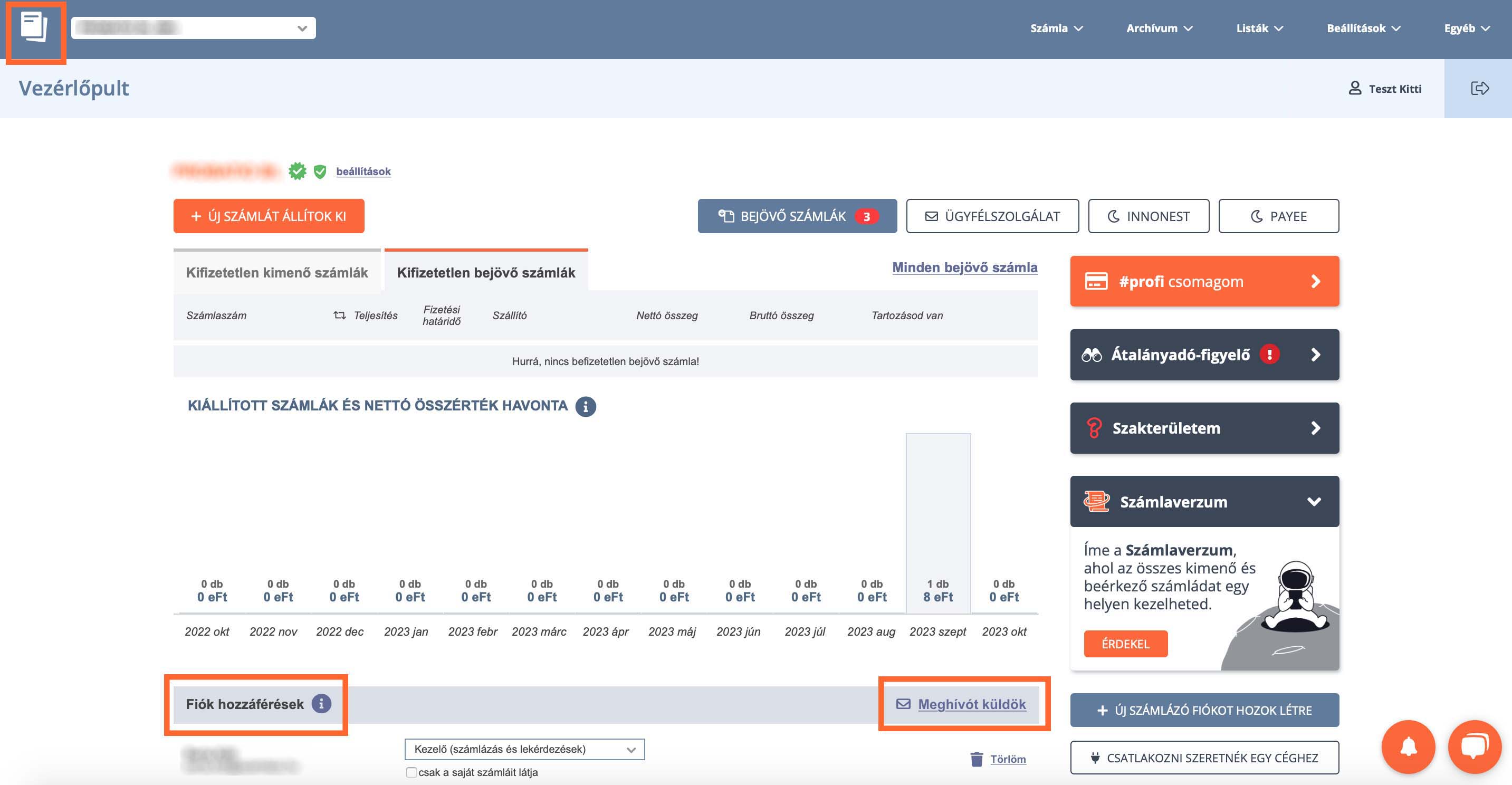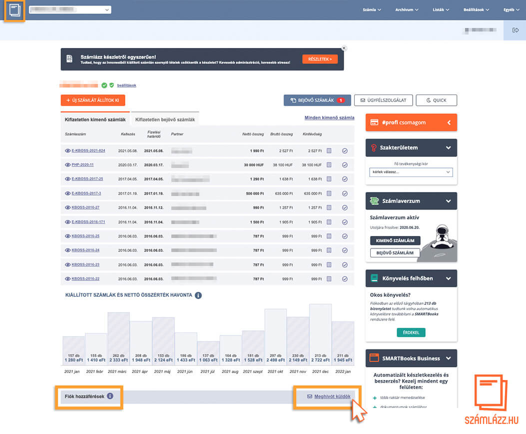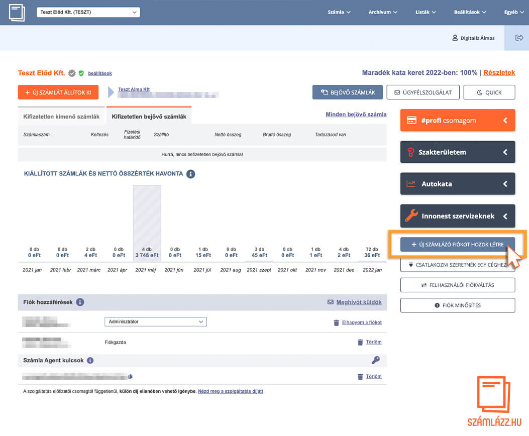 Ha a vállalkozásodnak létrehoztál számlázási fiókot, akkor egy gombnyomással meghívókat küldhetsz a kollégáidnak, vagy – aki igazán hálás lesz ezért – a könyvelődnek. Egy könyvelőt olvasási joggal akkor is meghívhatsz a számlázási fiókodba, ha a #free csomagot használod. Ha másmilyen jogosultságot szeretnél adni munkatársaidnak, vagy egynél több felhasználót szeretnél meghívni, akkor ehhez legalább #start szolgáltatáscsomaggal kell rendelkezned.