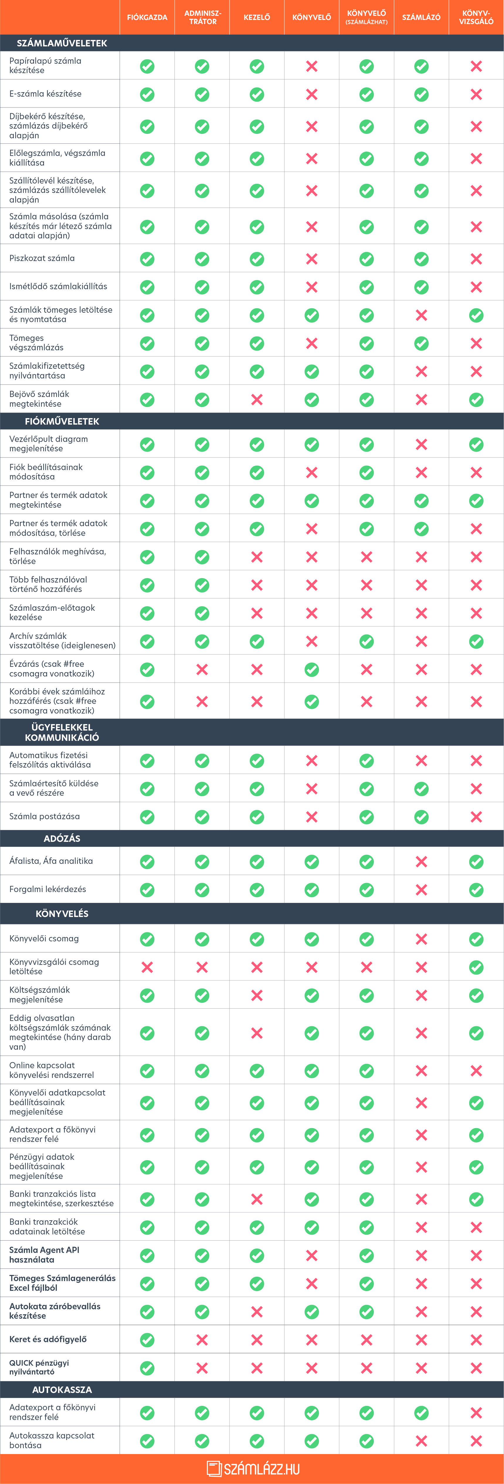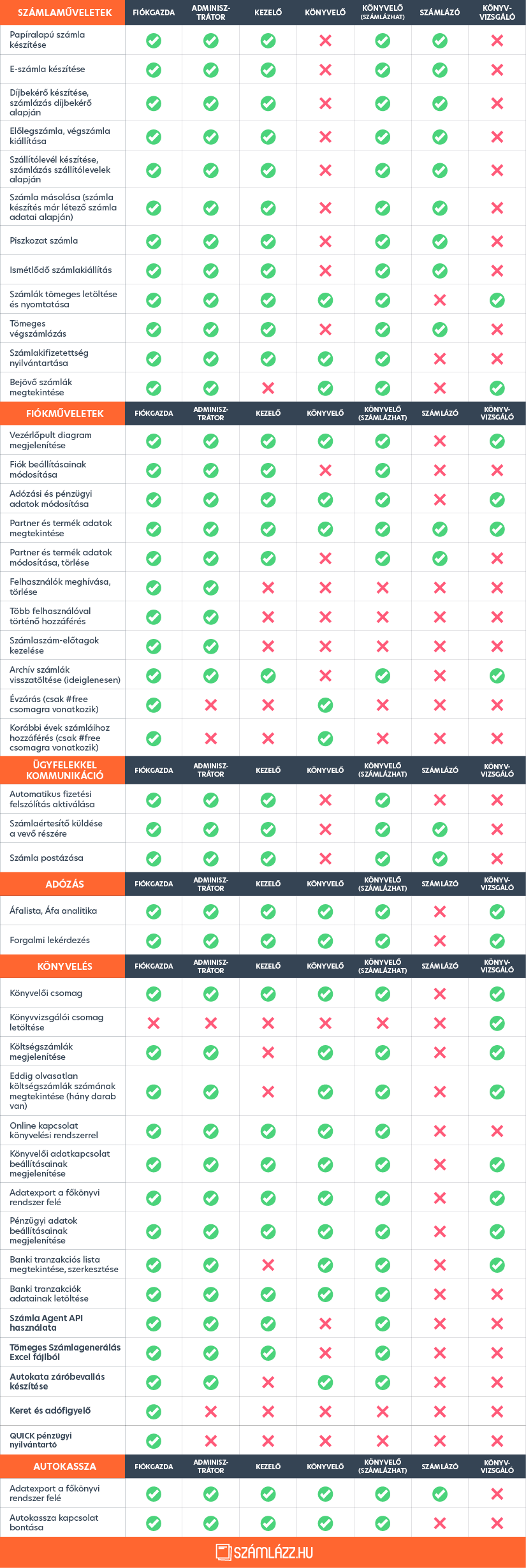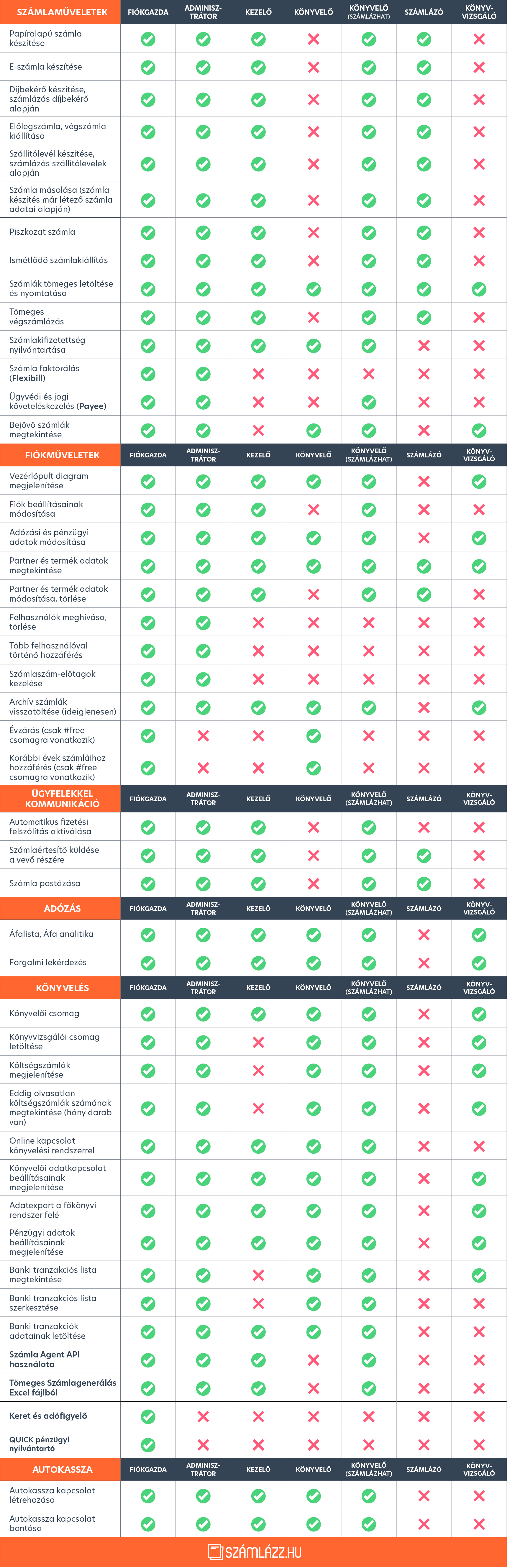 - Könyvelő (#free csomagban is elérhető): Csak olvasási joga van. Amennyiben a számlázási fiókban valamely díjköteles szolgáltatáscsomag érhető el, lekérdezéseket futtathat, listákat és adatexportot kérhet a könyvelői rendszer felé, valamint módosítani tudja az adózási és pénzügyi adatokat.