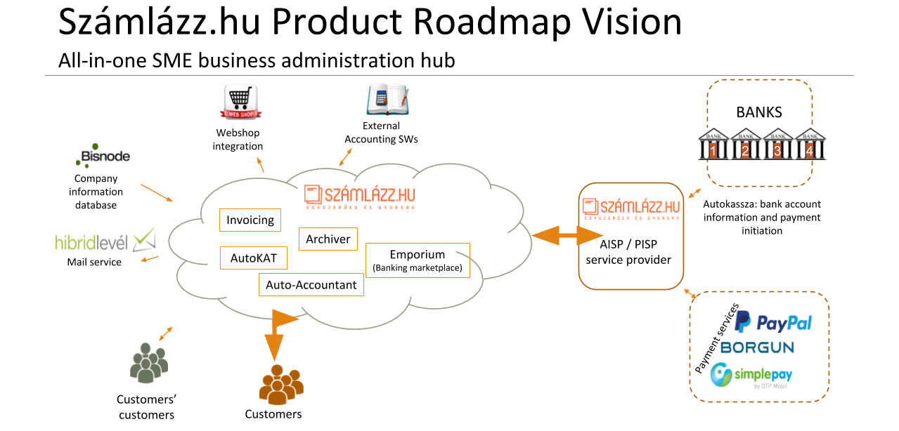 Ezért készülünk a számlázás mellett az elektronikus payment, és más, a PSD2 által lehetővé tett megoldásokra, ezért nyitunk a minél teljesebb körű digitális ökoszisztéma létrehozása felé. Minden olyan eszközt, amire egy kis- és középvállalkozás életében szükség van, szeretnénk felkínálni a Számlázz.hu felhasználóinak.