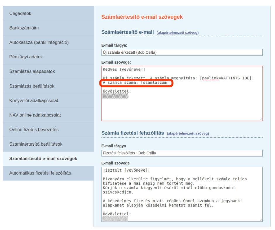 - Ha mostantól a számlaszámot is szeretnéd megjeleníteni a számlaértesítő levelekben, melyeket a rendszerből küldesz, a levél szövegében vagy tárgyában helyezd el ezt: [számlaszám]! (Épp úgy, ahogy a [vevőneve] a megszólításban alapbeállításunk szerint szerepel!)