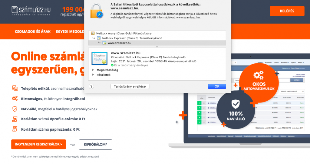 Egyre azonban figyeljünk: ha egy oldal a jelszavunkat kéri, de nem https szabványt használ, akkor ne adjunk meg semmit. Viszont azt se gondoljuk, hogy ami https, vagy amit a böngészőnk biztonságosnak gondol, az épp olyan biztonságos, mint egy banki rendszer: ez csak arra utal, hogy titkosított csatornán folyik a kommunikáció. Az már más kérdés, hogy a másik oldalon a weboldal tulajdonosa hogyan kezeli a titkosan átküldött, a másik oldalon dekódolt adatainkat, mennyire vigyáz rájuk. A Számlázz.hu például épp úgy, mint egy bank vagy pénzintézet: a létező legmagasabb biztonságú eljárások szerint.