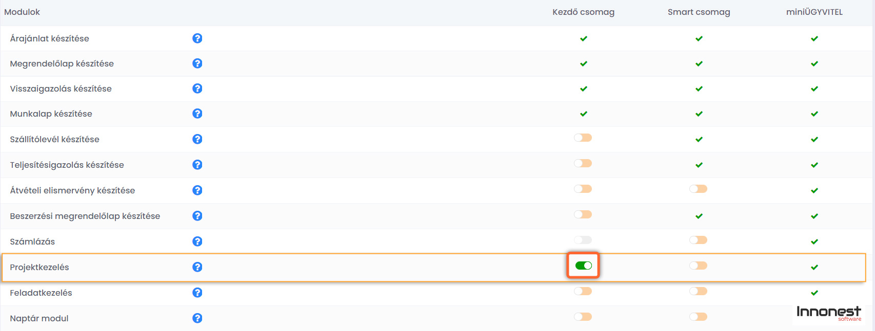 Az Innonest #free, #start, #digital és #profi Számlázz.hu-s szolgáltatáscsomagokban is elérhető. A #free szolgáltatáscsomag használatával Számla Agent díj fizetése mellett, #start, #digital csomaggal pedig külön díj fizetése nélkül elérhető a számlázás funkció. A #profi ügyfeleink korlátozás nélkül minden számlázási funkciót, díjbekérő küldését is használhatják az Innonestben! A projektkezelés modul pedig az Innonest miniÜGYVITEL díjcsomagjában érhető el. DE ha nincs szükséged a teljes miniÜGYVITEL-re, a Smarty csomagban is bekapcsolhatod a projektkezelést, így csak azért a funkcióért kell pluszban fizetned 790 Ft + áfa/hó (vagy 7 900 Ft + áfa/év) összeget! Ehhez nem kell mást tenned, csak az Előfizetés/Díjcsomag menüpontban bepipálni a funkciót.