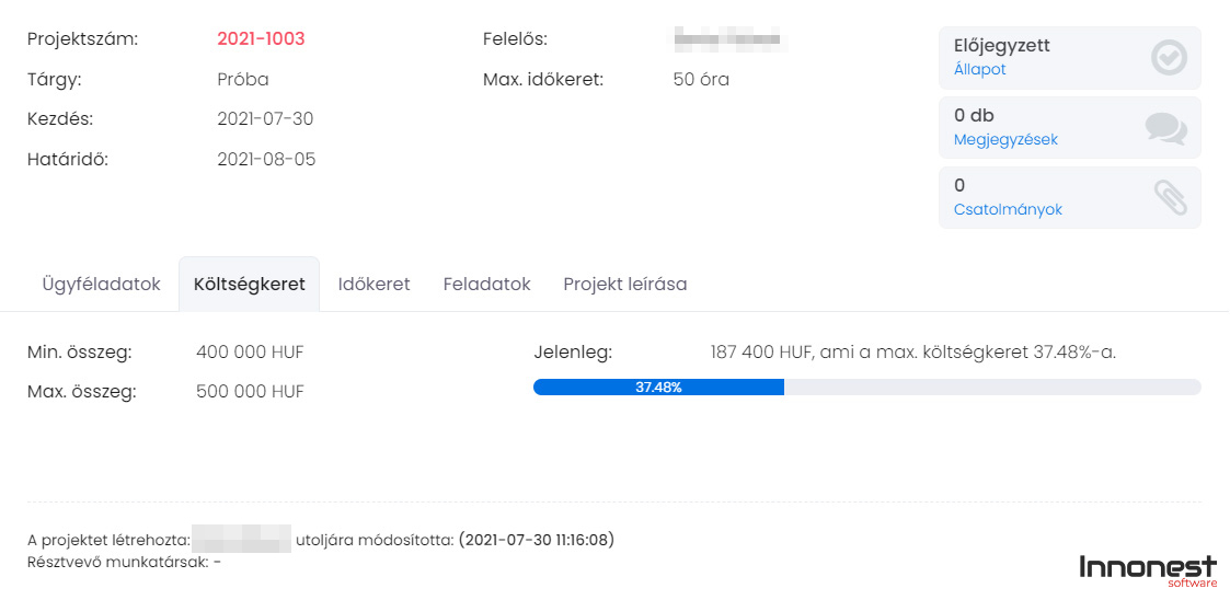 A projekt felvételénél lehetőség van ügyféladatokat és kapcsolattartót rögzítenünk. Megadhatunk időkeretet és költségkeretet a projekthez, kollégáink közül megjelölhetjük a résztvevőket és a felelőst is, megjegyzéseket és csatolmányokat is rendelhetünk hozzá.
