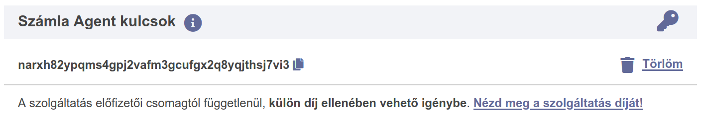Első lépésként egy Számla Agent kulcsra van szükség, amivel a Számlázz.hu rendszere azonosít minket, így biztonságosan állíthatunk ki számlát a saját fiókunkból. Ilyen Agent kulcsot bejelentkezés után, a kezdőoldal alján, a kulcs ikonnal tudunk generálni.