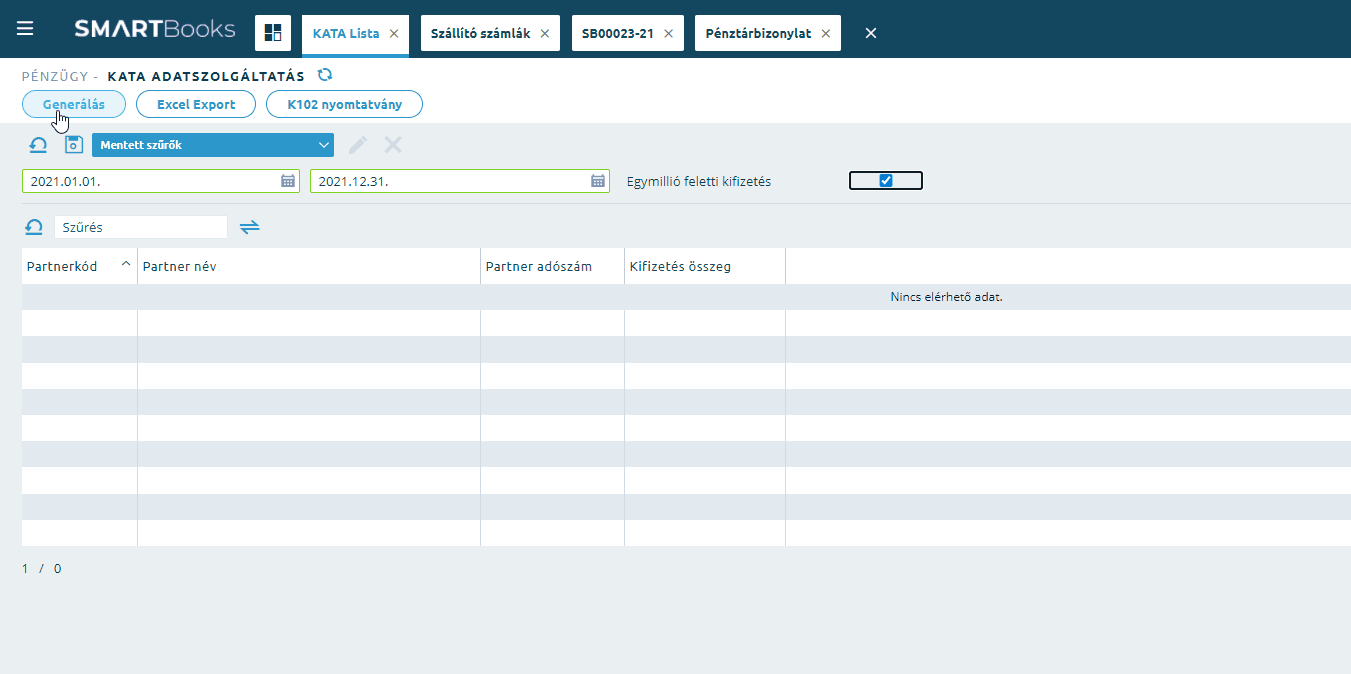 TIPP: Az adatszolgáltatás készítése előtt célszerű a katás partnerek folyószámláját ellenőrizni, hogy a számla és a kapcsolódó kifizetések összepontozásra kerültek-e.